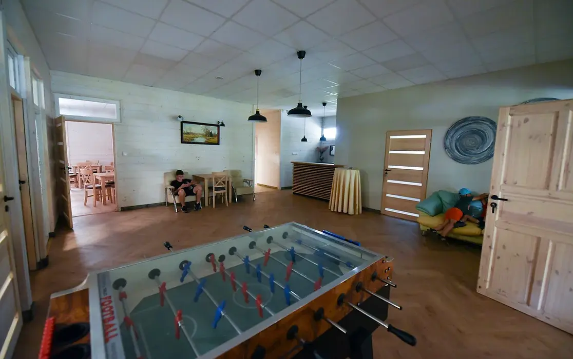 Posiadamy 100 miejsc noclegowych w domkach campingowych 2-;3-;4-;5- osobowych z pełnym węzłem sanitarnym, 2 domki 10 osobowe w każdym 2 pokoje 3 osobowe i 1 pokój 4 osobowy; 2 domki 14 osobowe w każdym 2 pokoje 3 osobowe i 2 pokoje 4 osobowe. Oferujemy restauracje z potrawami kuchni domowej oraz kawiarnię, świetlicę, basen kąpielowy, kajak, rowery, kort tenisowy, boisko do siatkówki plażowej i trzy boiska trawiaste do piłki nożnej, boisko pełnowymiarowe i dwa boiska o zmniejszonych wymiarach, salę do ćwiczeń o powierzchni 150 m2 wyposażoną w maty puzzle.Gwarantujemy prawdziwy relaks w nieskażonym środowisku bez smogu ze zdrową żywością.